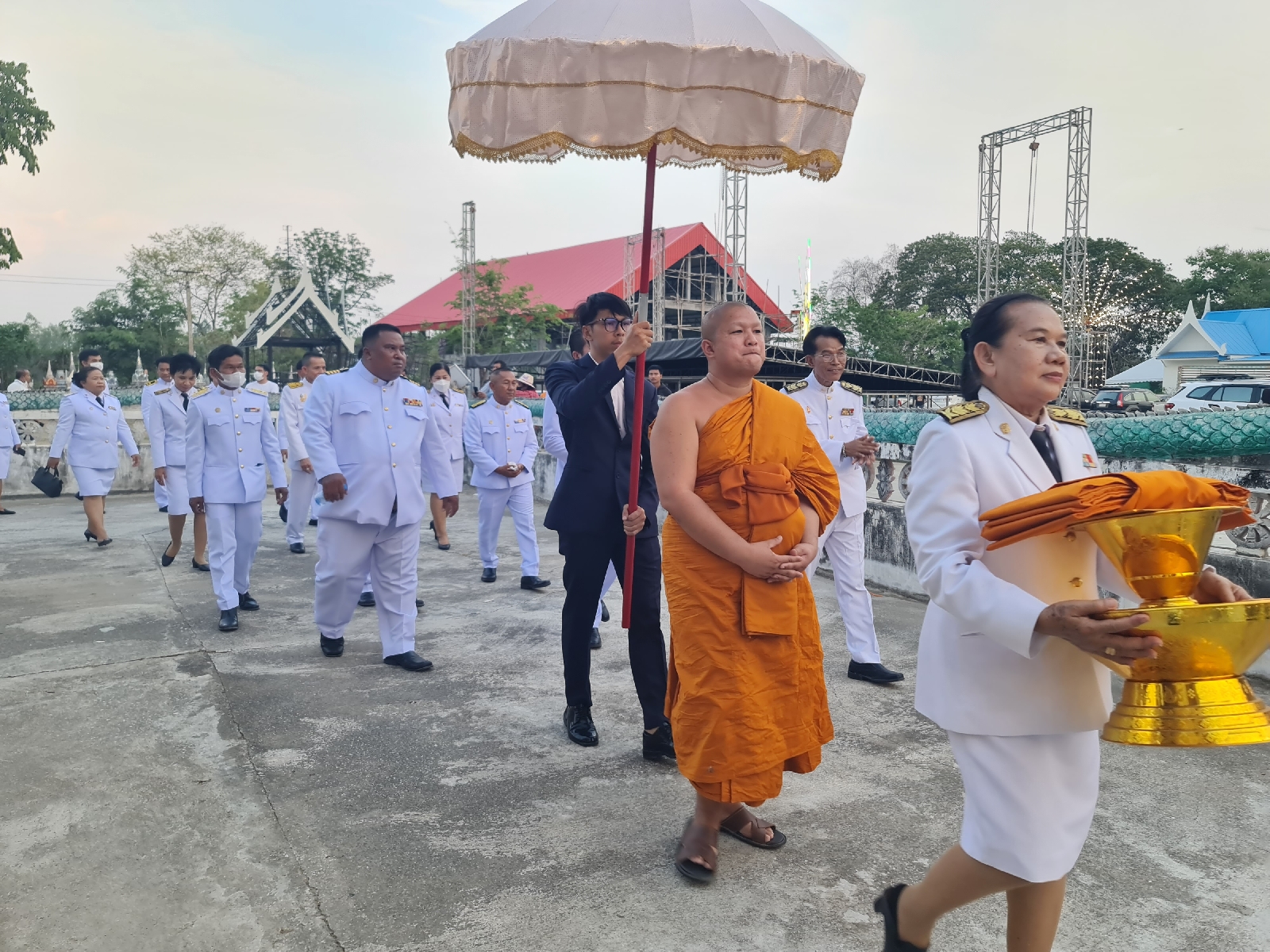 โดยในเวลา 17.00 น บรรดาศิษย์ยานุศิษย์ และพี่น้องชาวหนองกระดูกเนื้อและใกล้เคียง จัดรถยนต์แห่ สัญญาบัตร พัดยศ และผ้าไตรพระราชทาน จากวัดศรีสุธรรมาราม อ.ลาดยาว มายังวัดหนองกระดูกเนื้อ พร้อมเวียนประทักษิณรอบอุโบสถ 3 รอบ หลังจากนั้น พระสงฆ์ พุทธสาริกชน พร้อมกัน ณ ศาลาสัญญโตอนุสรณ์ และขบวนแห่อัญเชิญสัญญาบัตร พัดยศ ผ้าไตร ตั้งบนแท่นรับรอง